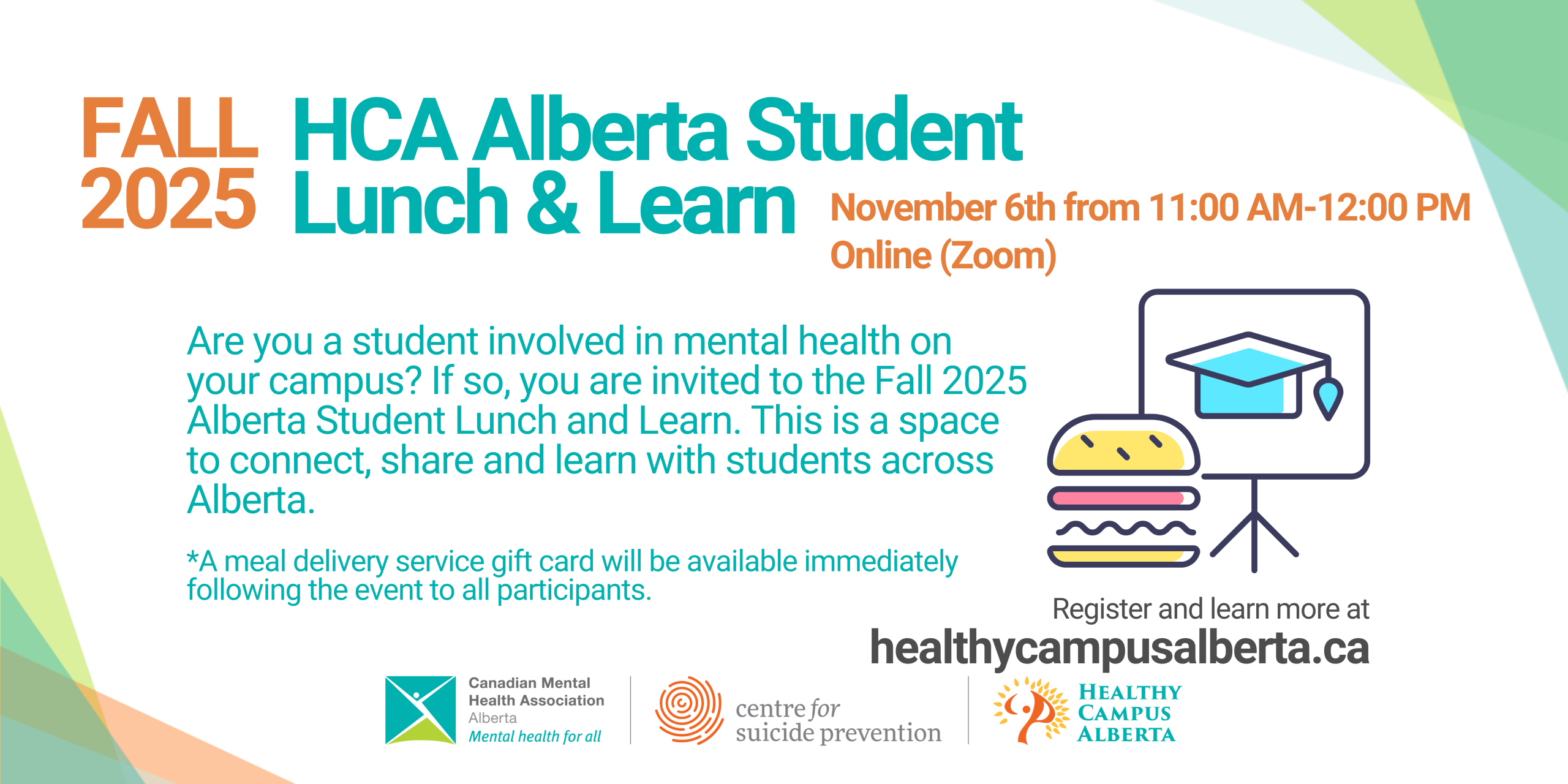 Are you a student involved in mental health on your campus? If so, you are invited to the Fall 2025 Alberta Student Lunch and Learn on Thursday November 6th from 11am – 12pm.